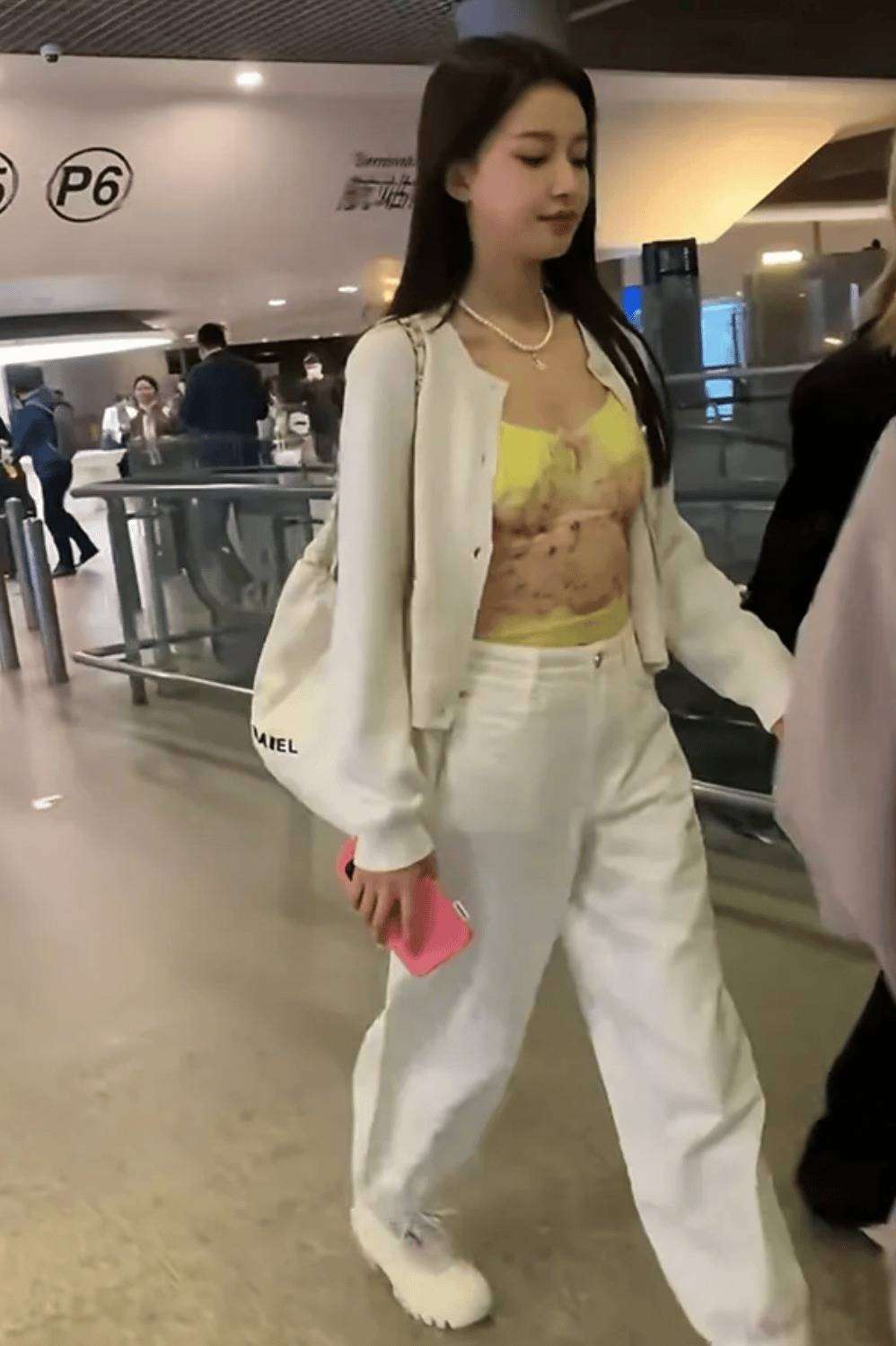 内搭选了件黄底花纹的透视吊带,薄纱材质若隐若现,带着点慵懒的性感,又不会露得过分。外面叠了件宽松的白色开衫,软乎乎的针织质感中和了透视肚兜的妩媚,让性感裹上了层随性大方的感觉。下装搭了条垂坠感十足的白色阔腿裤,高腰版型直接把腰线拉到胸腔下,藏住了胯部的小肉肉,又用宽松裤型平衡了上半身的紧。